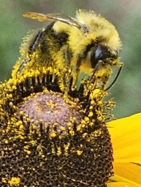 A Bumble Bee, covered in pollen, on a Black-eyed Susan flower central mound.