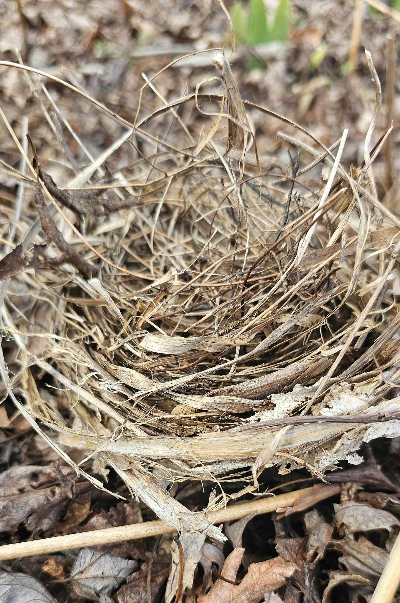 This top part of a nest that fell to the ground in my yard shows the variety of types of materials used. Visible are twigs, pine needles, dead slender leaves (daylilies from my yard), small tree leaves. These are exactly the kinds of debris people remove for the sake of “fall clean up” or “garden tidying”. What’s a bird to do without your help?