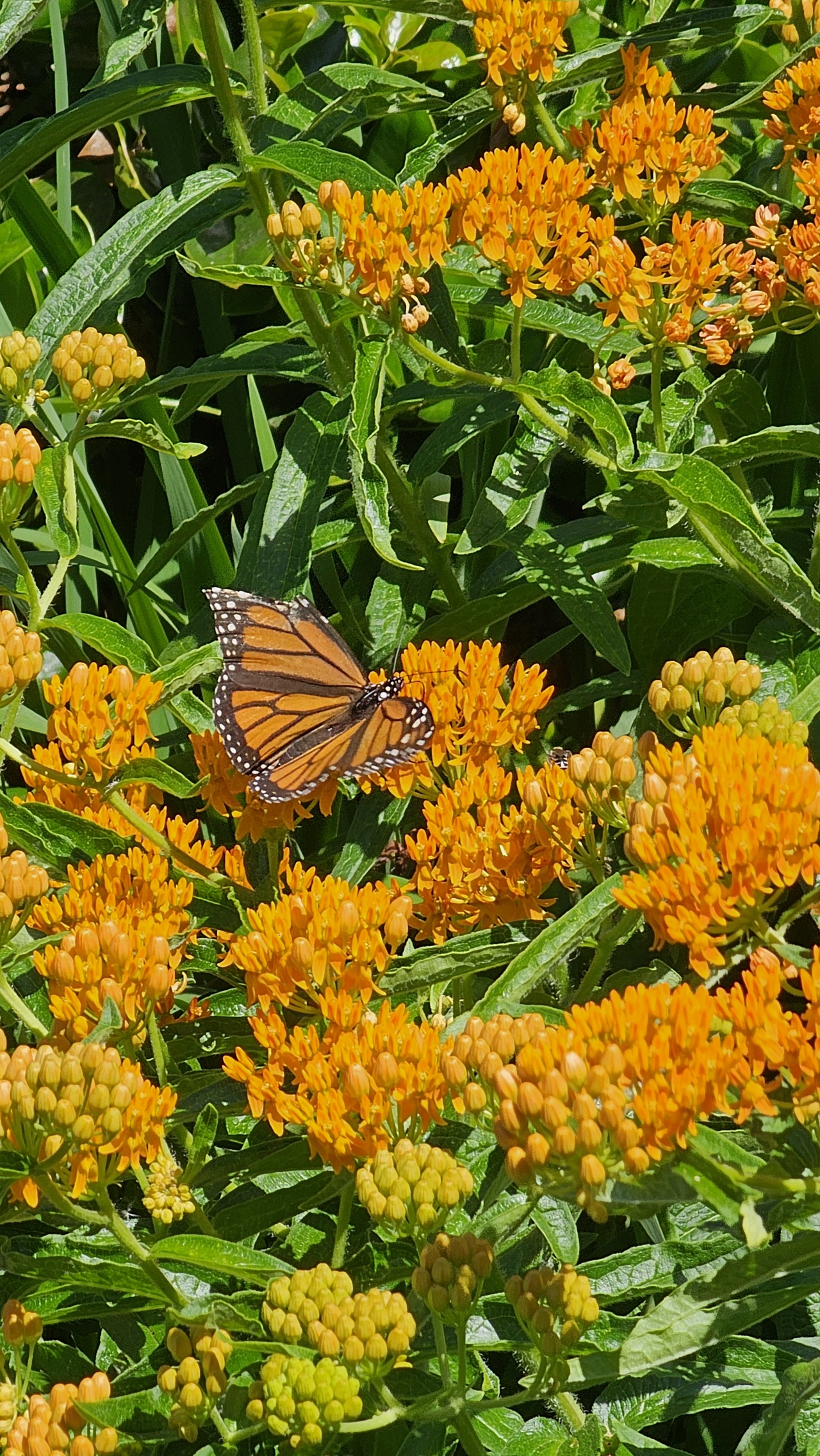 Butterfly weed is allowed to grow freely in one of my garden beds and attracts all kinds of pollinators. Monarchs appear also to be laying eggs and successfully reproducing here. When designing, add space for native plants which are the foundation of habitat for birds, native bees, and butterflies.